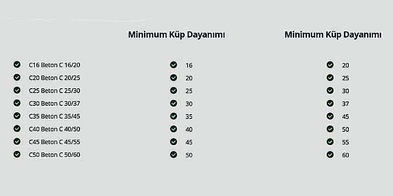Hazır Beton sınıfları; C40 Beton, C35 Beton, C30 Beton, C25 Beton, Şap Beton, Brüt Beton, Dmax Beton, Katkısız Beton...